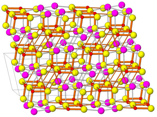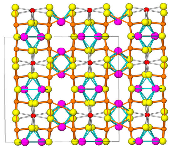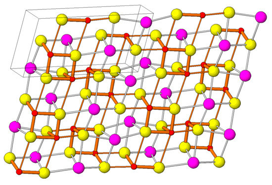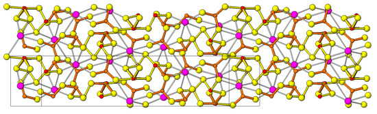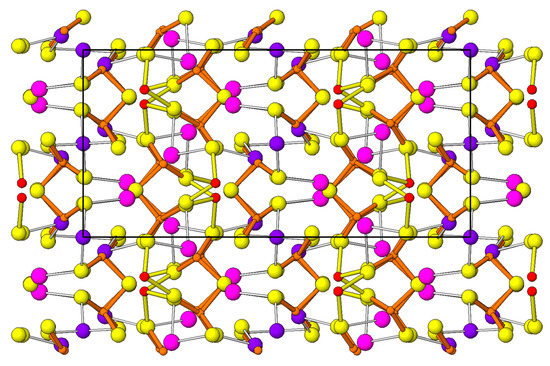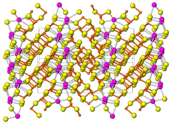 Perpendicular projection of the strongly-bonded TlSbS2 (010) double layer (Tl—large mauve spheres, Sb—brown spheres). Note the tightly-bonded Sb2S4 coordination pairs.