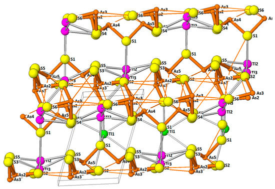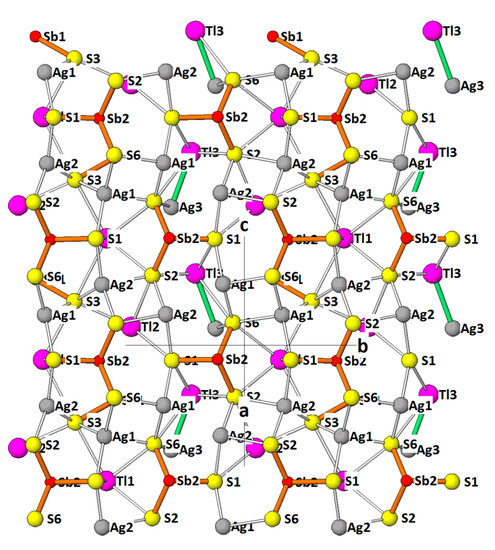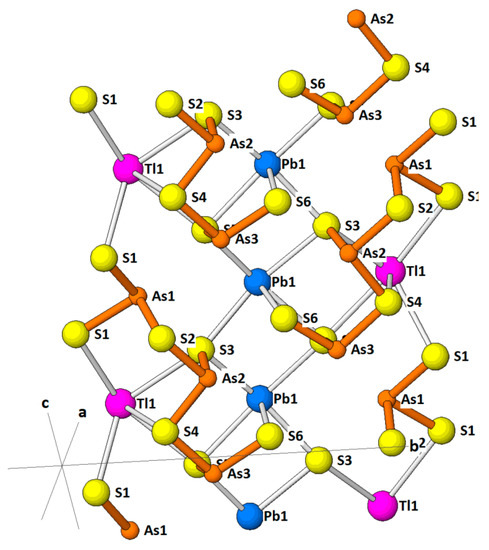 The structural data on weissbergite, TlSbS2, by Rey et al. [23] indicate space group P-1, a 6.123 Å, b 6.293 Å, c 11.838 Å, α 101.34°, β 98.39°,γ 103.21°, unit cell volume 426.61 Å3. The crystal structure is of a general SnS archetype, with a shift of tightly-bonded Tl–Sb (010) double-layers yielding a typical SnS-like arrangement in projection along [20-1]. Orientation of long M–S distances and of the trigonal prismatic spaces for the lone electron pairs of especially Sb is uniform throughout (Figure 4). In the (010) atomic layers, Sb forms coordination pyramids with trapezoidal bases, paired together via short Sb–S bonds to two common sulfurs, i.e., via the shortest S–S edge. Tl forms irregular, larger pyramids completed by two long distances in the interlayer space.