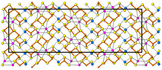 The crystal structure of the selenosalt TlSbSe2 [24] is also based on SnS archetype. The high-temperature modification (above 380 °C), has statistical disorder of Tl and Sb over one cation position of the space group Amam, with unit cell defined by a 4.514 Å, b 11.979 Å and c 4.198 Å (measured on a quenched sample). Slow cooling produces a partial ordering, whereas the ordered low temperature phase (Figure 6) has space group P21, a 9.137 Å, b 4.097 Å, c 12.765 Å, β 111.75°, unit cell volume 443.8 Å3 [24]. The two Sb positions are similar: the square coordination pyramid of Sb1 has the Sb–S vertex bond 2.576 Å, base bonds: 2.762 Å opposed by 3.025 Å, another one 2.780 Å versus 3.047 Å, and the under-base distances equal to 3.919 and 3.940 Å. For Sb2, the same sequence is 2.580 Å, opposing pairs 2.788–3.000 Å, 2.812–3.000 Å, under base of the pyramid 3.820 and 3.855 Å. Antimony pyramids are connected via pyramidal edges, forming [010] double chains, which then give (100) layers via the under-base interactions.