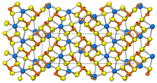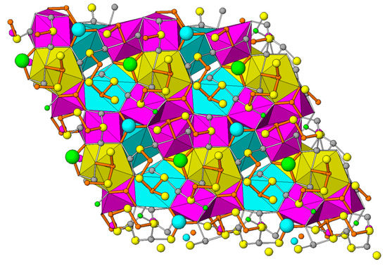 - Makovicky, E.; Topa, D.; Stöger, B. The crystal structures of heptasartorite, Tl7Pb22As55S108, and enneasartorite, Tl6Pb32As70S140, two members of an anion-omission series of complex sulfosalts from Lengenbach, the Swiss Alps, and comparison with the structures of As-Sb sartorite homologues. Eur. J. Miner. 2018, 30, 149–164. [Google Scholar] [CrossRef]
