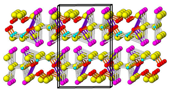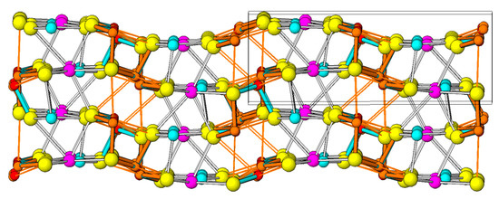 Sb1–Sb2 pairs on one side of the double layer decorate unit cell corners (Figure 5), whereas the pair on the opposing surface is central to the cell and inverted in respect to the opposite side. The pyramidal vertex is at Sb–S equal to 2.405 Å for Sb1, the opposing distances in the base are 2.448–3.690 Å and 2.602–2.961 Å. For Sb2, the same sequence is 2.433 Å, 2.456–3.702 Å, and 2.710–2.812 Å. This might indicate certain amount of cation flipping in respect to one of the bond pairs, especially in the case of Sb2, across the weakly bonded (001) interspace. The long interlayer Sb–S distances are 4.018 Å and 3.839 Å; their bifurcation is rare.