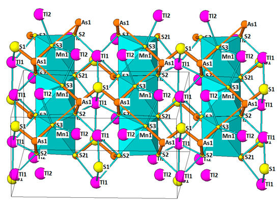 - Gostojić, M.; Edenharter, A.; Nowacki, W.; Engel, P. The crystal structure of synthetic Tl2MnAs2S5. Z. Kristallogr. 1982, 158, 43–51. [Google Scholar] [CrossRef]