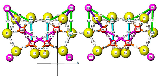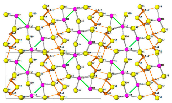 Thallium coordinations start at fairly low Tl–S distances, 3.071 Å and 3.181 Å for Tl1 and 3.046–3.059 Å for Tl2. The intralayer distances reach 3.374 Å at maximum. The (010) interspaces are the basis of cleavage observed.