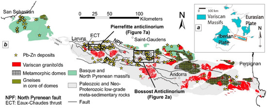 This study focuses on Pb-Zn deposits located in the Bossòst anticlinorium (Figure 1) [42,44,51] and includes a comparison with Pb-Zn deposits occurring in the Pierrefitte anticlinorium. The southern part of the Bossòst anticlinorium forms the Aran Valley synclinorium. The northern part is limited by the North Pyrenean fault (Figure 2a). It is mostly composed of Cambrian to Devonian rocks and an intruding Late-Variscan leucocratic granite named the Bossòst granite.