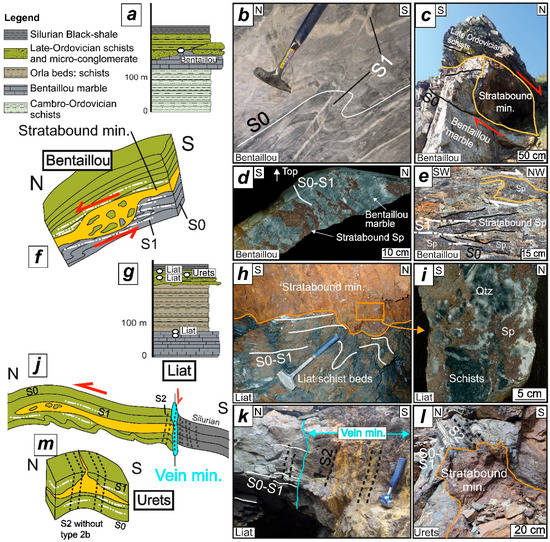 In intensely deformed and metamorphosed terranes, the simple geometric link between mineralization and stratification is not relevant enough to distinguish between sedimentary or structural control. Structures are often parallelized due to pervasive tectonic events which makes the structural analysis difficult. Reworking of the ore-body during deformation can have obliterated geochemical tracers like isotopic data, especially Pb isotopes [77,78,79]. Consequently, a detailed structural study from regional to micro-scale focusing on the relationships between mineralization and cleavages is crucial. Pinpointing locations where structures like cleavage are secant (fold hinge), as well as deciphering textural relations between metamorphic minerals and mineralization, will lead to a better understanding of the ore-body genesis.