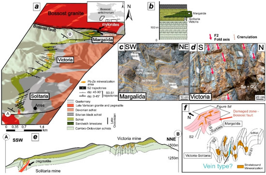 Margalida-Victoria-Solitaria district (see location on Figure 2a). (a) Structural map (lithologies are based on IGME geological map (Spain, Aran Valley; Garcia-Sansegundo et al. [1]) and location on the Bossòst anticlinorium (pre-Silurian rocks); (b) stratigraphic log; (c) stratabound Pb-Zn mineralization in Margalida mine hosted in Sandwich limestone level; (d) typical stratabound folded mineralization (F2 isoclinal folds) in Victoria; (e) structural NNE-SSW cross-section of Victoria-Solitaria area; and (f) structural model of Margalida and Victoria-Solitaria mines. Mineral abbreviations: Cal—Calcite; Qtz—Quartz; Sp—Sphalerite.