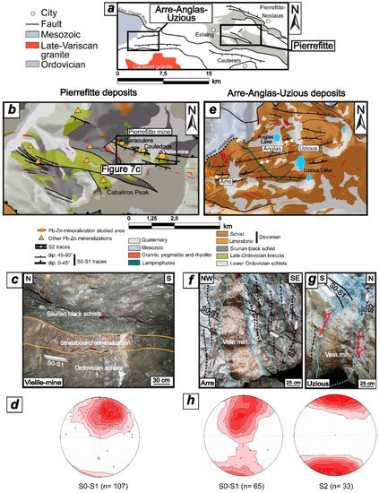 The Pierrefitte mines (Garaoulere, Couledous, Vieille-Mine) are located at the contact with Late Ordovician rocks mainly carbonate breccia. N100–110°E S0-S1 foliation moderately dips (20° to 60°) to the south (Figure 7d).
