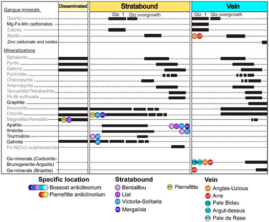 Paragenetic succession of ore and gangue minerals for all the eleven Pyrenean-studied Pb-Zn deposits. Minerals in grey are common to both stratabound and vein mineralizations and minerals in black are only present in stratabound or vein. Minerals only reported in a deposit are noted with the deposit circle. Several minerals like apatite, ilmenite, or tourmaline are only present in stratabound mineralization. Ge-minerals, graphite zinc carbonates or oxides, and Mg-Fe-Mn carbonates are only observed in vein mineralization (n = 110).