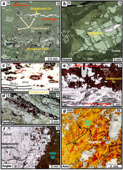 Microphotographs showing characteristics textures in the three mineralization types. (a) Bentaillou disseminated mineralization truncated by stratabound mineralizations (reflected light); (b) stratabound Victoria folded mineralization which intersects gahnite D1 metamorphic mineral (reflected light); (c) syn-kinematic sphalerite which crystallizes in asymmetric pressure shadows around clasts of magnetite in Pierrefitte mine (transmitted light); (d) sphalerite mineralization from Pierrefitte mine parallel to S1 and in F1 isoclinal fold hinge. Mineralization intersects S0 stratification (transmitted light); and (e) stratabound sphalerite and quartz mineralizations which intersect pelitic host rock in Liat mine. Sphalerite is interpreted syn-kinematic D1 (transmitted light); (f) vein mineralization in Anglas mine which intersect S0-S1 and parallel to S2 cleavage marked by metamorphic cordierite (transmitted light); and (g) deformed and recrystallized vein sphalerite in Arre deposit. The two textures are identified with white line Recrystallization area in yellow marked S2 cleavage (transmitted light). Mineral abbreviations: Cal—Calcite; Ghn—Gahnite; Gn—Galena; Mag—Magnetite; Ms—Muscovite; Qz—Quartz; Sp—Sphalerite.