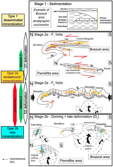 Stage 2b occurs during the doming phase and the late-Variscan Type 2b vein mineralizations (Figure 11). This mineralization type preferentially occurs parallel to the vertical S2 cleavage and is mostly observed in the Pierrefitte and Bossòst anticlinoriums. Pull-apart-type structures are observed in Pale Bidau and Uzious mines. A late deformation D3 corresponds to faults like the Bossòst mylonitic fault close to Margalida district.