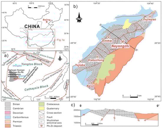 The Nayongzhi deposit, located in the southeastern margin of the Sichuan-Yunnan-Guizhou (S-Y-G) Zn-Pb metallogenic province, China (Figure 1a), is the largest Zn-Pb deposit in northwestern Guizhou Province. This deposit, exploited by the most recent mining operation, has an estimated resource of 1.52 Mt of metal at average grades of 4.82 wt % Zn and 0.57 wt % Pb [17,18]. The salient aspects of the geological characteristics of the deposit, including ore-controlling factors, ore-forming material and fluid source, and mining projects of the Nayongzhi deposit, have been discussed in a number of papers [17,18,19,20,21,22,23,24,25]. Some authors consider that the metals were mainly derived from the basement rocks based on the Pb isotopic results of sulfides [17,18]. Meanwhile, the S isotopic compositions of sulfides reflect the enrichment of 34S in hydrothermal fluid (δ34Sfluid > +11.8‰), and such S isotopic signatures show that thermochemical sulfate reduction (TSR) is the principal mechanism for the formation of S2− [17,18]. However, the genesis of this deposit is still debated. Several remarkable studies have proposed very different genetic models, including Sedimentary-exhalative (Sedex) [23], sedimentation-hydrothermal reformation [24] and Mississippi Valley-type (MVT) lead-zinc deposit models [25].