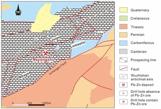 The Nayongzhi deposit (26°25′ N, 105°38′ E) is located in the southeast margin of S-Y-G region, 40 km north-northwest of Puding city. The ore deposit is situated on the NE-trending asymmetric Wuzhishan overturned anticline (Figure 1b) that trends 315° with an axial plane dipping to the SE (Figure 1c); this anticline is 16 km in length and 4 km in width, where are distributed several lead-zinc deposits (e.g., Dujiaqiao, Nayongzhi, Xinmai, Xiabuchong, Yujiaba and Narun ore deposits; Figure 1b).