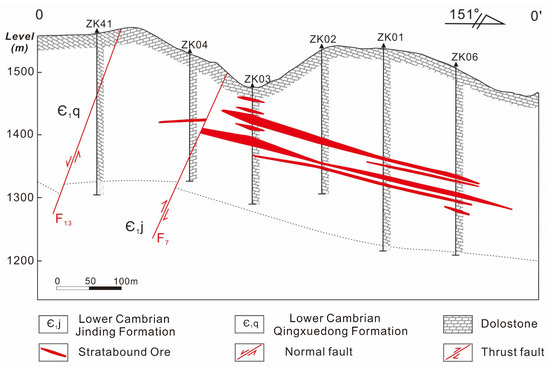 Geologic cross section 0-0′ through the Nayongzhi deposit, revealing the distribution of ore bodies, faults and strata (modified from Jin et al. [17]).