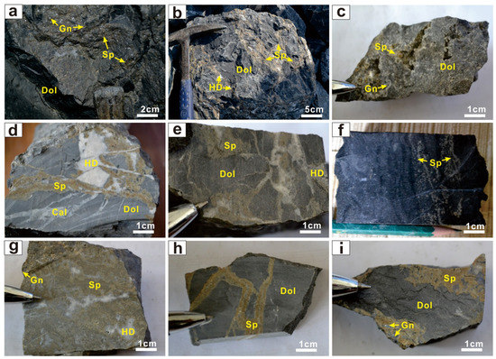 Mineralization occurs in massive ores (Figure 4a,g), breccias (Figure 4b–e), disseminated ores (Figure 4f) and veins (Figure 4h,i) in this deposit. Both sulfide and supergene ore are developed in the Nayongzhi deposit. Primary sulfide minerals are sphalerite, and galena and with minor pyrite in the Nayongzhi deposit (Figure 4a–i). Supergene ore is composed of smithsonite, goethite and cerussite [17]. The common gangue minerals are dolomite, calcite, with minor barite.