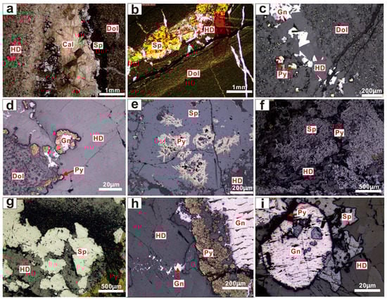 Microphotographs of representative samples from the Nayongzhi deposit. (a) Sphalerite and calcite intergrowth with hydrothermal dolomite. (b) Euhedral sphalerite and hydrothermal dolomite fill the fractures of dolostone. (c) Galena and pyrite fill the fractures of dolostone. (d) Galena wrapped by pyrite and hydrothermal dolomite. (e) Sphalerite intergrowth with pyrite. (f) Pyrite fill the edge of euhedral sphalerite granule (g) Euhedral sphalerite is around by hydrothermal dolomite. (h) Galena intergrowth with pyrite. (i) Galena replaced by sphalerite. Photomicrographs (a,b) were taken under transmitted plane-polarized light, and (c–i) were taken under reflected plane-polarized light. Abbreviations: Sp sphalerite; Gn galena; Py pyrite; Dol dolostone; HD hydrothermal dolomite; Cal calcite.