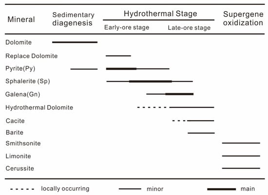 Based on the field and microscopic observations of crosscutting relationships of veins and paragenetic relationships of various hydrothermal minerals, the mineralization process has been classified into three stages (Figure 6), generally beginning from sedimentary diagenesis through hydrothermal mineralization followed by supergene oxidization, wherein the hydrothermal process can be divided into early-stage and late-stage according to distinct mineral assemblages. The early-stage mineralization is mainly massive ores and brecciated ores (Figure 4a,b,d,g,i), which consist of euhedral to subhedral coarse-grained sulfide minerals aggregates (sphalerite, galena and pyrite; Figure 5a,b,e–g,i), and veins or disseminated ores (Figure 4c,e,f,h) that is composed of subhedral to anhedral fine-grained aggregates (dominated by galena; Figure 5c). In the late-stage mineralization, gangue mineral hydrothermal dolomite and calcite occur as fragment or fine-veined aggregate cement that fill the fractures and voids of sulfide aggregation or wall rocks (Figure 4a–e,g).