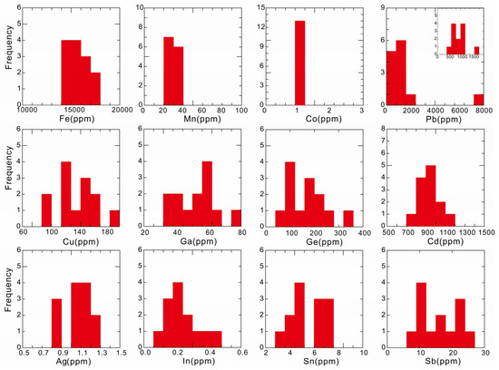 The trace elements in sphalerite that were determined with ICP-MS are summarized in Table 2, and histograms of the element contents are shown in Figure 7.