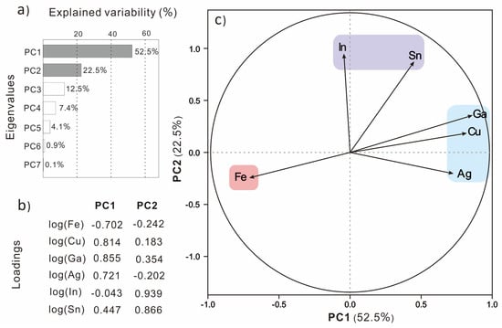 The results of the principle components analysis of the ICP-MS dataset are shown in Figure 8, where the element distributions highlight two principal components. Principal Component 1 (PC1) accounts for 52.5% of element content variability (Figure 8a), including Fe, Cu, Ga and Ag (loading PC1; Figure 8b), whereas Principal Component 2 (PC2) accounts for 22.5% of element content variability (Figure 8a), is composed of In and Sn (loading PC2; Figure 8b). Interestingly, PC1 is divided into two sub-groups: (Fe) and (Cu, Ga, and Ag). The element distributions are projected on the PC1 vs. PC2 plane, together accounting for 75.0% of element content variability (Figure 8c).