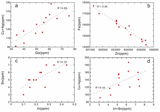 Correlation plots of (a) (Cu + Ag) vs. Ga, (b) Fe vs. Zn, (c) In vs. Sn, (d) (In + Sn) vs. (Ag + Cu) in sphalerite from the Nayongzhi deposit. Lines of best fit and R2 values are given. See the text for further explanation.