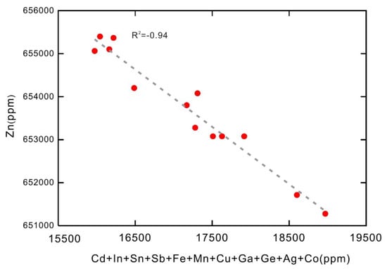 The strong anti-correlation between Zn and Fe (R2 = −0.96; Figure 9b) in our data support specific studies on trace element incorporation in sphalerite [6,8,51,52], which is suggestive of a direct substitution of divalent cations as Zn2+↔Fe2+ (Figure 8c). Moreover, Figure 10 shows that the strong negative correlation is observed among (Cd + In + Sn + Sb + Fe + Mn + Cu + Ga + Ge + Ag + Co) and Zn (R2 = −0.94), which suggests that those trace elements (Cd, In, Sn, Sb, Fe, Mn, Cu, Ga, Ge, Ag and Co) mainly exist in the form of isomorphism in sphalerite that is thought to be involved in the mechanism of their enrichment in sphalerite [4,5,53,54]. In addition, these elements of sphalerite that generally occur in obscure valences, such as Sb, Mn, and Tl, will need to have their oxidation states accurately determined by appropriate methods (e.g., X-ray absorption spectrum) in the future.