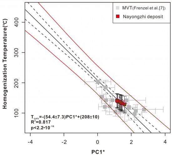 The homogenization temperature of the Nayongzhi deposit showing the GGIMFis geothermometer (modified after Frenzel et al. [7]). Note: the prediction intervals of linear fit are shown as the red lines. 95% confidence intervals are shown as the black dotted lines, while the line of best fit is shown as the black line.