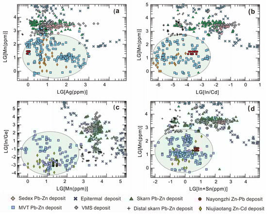 Binary plots of Ag vs. Mn (a), In/Cd vs. Mn (b), In/Ge vs. Mn (c), and In + Sn vs. Mn (d) in sphalerite from the Nayongzhi deposit and other Zn-Pb deposits in China, NE Europe, and Japan. Note: plots are based on data from Cook et al. [4] and Ye et al. [5,15].
