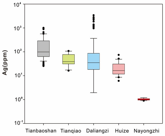 Ag content of sphalerite from Tianbaoshan, Daliangzi, Huize, Tianqiao and Nayongzhi deposit in S-Y-G Zn-Pb metallogenic province. Note: plots are based on data from Ye et al. [5,15], Li et al. [70] and Yuan et al. [71]. Minimum, maximum, median, lower quartile and upper quartile are indicated by the lowest point, the uppermost point, the line across the rectangular box, the upper boundary of the rectangular box, the lower boundary of the rectangular box of each column, respectively.