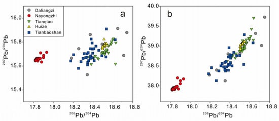 Correlative diagrams of 206Pb/204Pb VS. 207Pb/204Pb (a) and 206Pb/204Pb VS. 208Pb/204Pb (b) for the Tianbaoshan, Daliangzi, Huize, Tianqiao and Nayongzhi deposit in S-Y-G Zn-Pb metallogenic province. Note: plots are based on data from Jin et al. [17,24], Bao et al. [26], Liu and Lin [36], Zheng et al. [39,63], Chen et al. [62], Wang. [64], Zhang et al. [65], Fu [66], Wang et al. [67] and Zhou et al. [68,69].