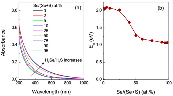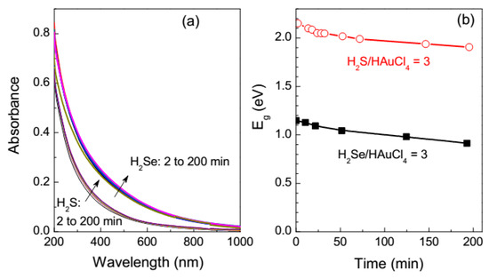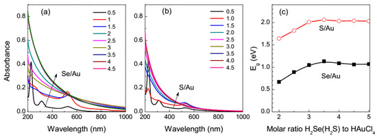 The spectra of the reaction mixtures with the molar ratio (H2Se + H2S)/HAuCl4 = 3 presented in Figure 2 demonstrate that the optical absorption increased and the Eg magnitude gradually reduced upon increasing the proportion of H2Se, and the Eg vs. H2Se/(H2Se + H2S) is asymmetric due to stronger Au–Se bonding in comparison with Au–S bonding.