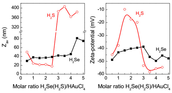 Hydrodynamic diameters Zav and zeta-potentials of the colloidal species at various ratios H2Se and H2S to HAuCl4 determined in 1 h after mixing the reactants.