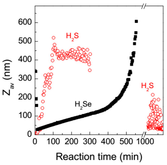 The effect of substitution of H2S for H2Se on the properties of colloidal products is difficult to elucidate because of very different reaction rates. In the initial stages, when smaller dense liquid species are believed to arise and submicrometer droplets are absent yet [55,56,57,58], a steady increase in Zav from 20 nm to 40 nm and zeta-potential magnitude from about −35 mV to −50 mV as the relative concentration of H2Se increased (Figure S1, Supplementary data).