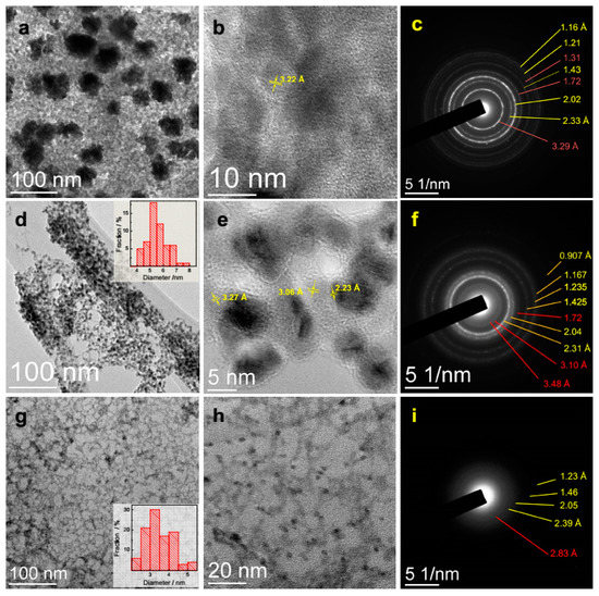 TEM images and selected area electron diffraction patterns of the air-dried solutions of (a–c) 0.3 mmol/L HAuCl4 + 0.9 mmol/L H2Se, (d–f) 0.3 mmol/L HAuCl4 + 0.45 mmol/L H2Se + 0.45 mmol/L H2S; (g–i) 0.3 mmol/L HAuCl4 + 0.9 mmol/L H2S after about 1 h reaction. The data illustrate the formation of gold nanoparticles via post-synthetic decomposition of disordered gold chalcogenides (less contrast material), see the text for detail.