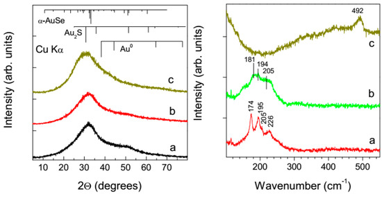 X-ray diffraction patterns (left panel; the reflections of Au0, Au2S, and α-AuSe are shown for comparison) and Raman scattering (right panel) of the products deposited from aqueous solutions of (a) 0.3 mmol/L HAuCl4 + 0.9 mmol/L H2Se, (b) 0.3 mmol/L HAuCl4 + 0.45 mmol/L H2Se + 0.45 mmol/L H2S; (c) 0.3 mmol/L HAuCl4 + 0.9 mmol/L H2S after 1 h reaction and dried in air.