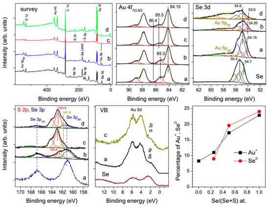 X-ray photoelectron spectra (Figure 8, see also Table S1, Supplementary data) characterize the net composition and chemical state of atoms in surface layers of roughly 2 nm thick, which, though, may be modified in the ultra-high vacuum conditions and under X-ray irradiation. The binding energy (BE) of the main peak Au 4f7/2 (84.14 ± 0.05 eV) is slightly higher than that of bulk metal (84.0 eV); this may be due to either the final state effect that is characteristic of nanoparticles less than about 5 nm, or the chemical shift caused by the transfer of electrons from Au to chalcogen atoms [60,61]. A second, less intense peak at 85.4 ± 0.1 eV decreased several times and slightly shifted to a higher BE upon substitution of H2Se for H2S in the reaction media. Also, there is a minor signal at 86.4 eV from Au3+–Cl species.