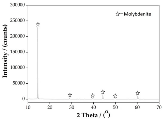 The pure molybdenite sample used for contact angle measurements was supplied by CMOC. The high-grade molybdenite was first selected by hand. Then, they were crushed and ground in a ceramic ball mill. The grinding products were further enriched with collectorless flotation. Finally, the purified molybdenite was screened to obtain the −38 µm fraction for powder contact angle measurements. The purified molybdenite sample with X-ray diffraction analysis shows 99 wt % molybdenite. The XRD analysis result of this sample is shown in Figure 1.