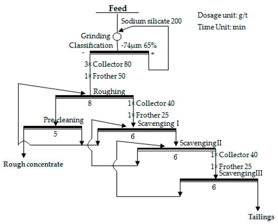 An industrial-scale test was conducted in the workshop of the Second Dressing Company of China Molybdenum Co., Ltd. There are three sets of the same flotation system. The industrial-scale tests were conducted on two flotation system, using XLM and DO as collectors, respectively. The feed was 1800 t/d in each flotation system. The Mo ore used in the industrial-scale test was from Mo ore for daily production. The industrial-scale tests flow-sheet and reagent conditions are shown in Figure 3.