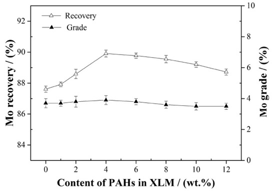 Figure 4. Influence of the content of PAHs in XLM on molybdenite flotation in HCFW (800 mg/L Ca2+, pH = 8–9).