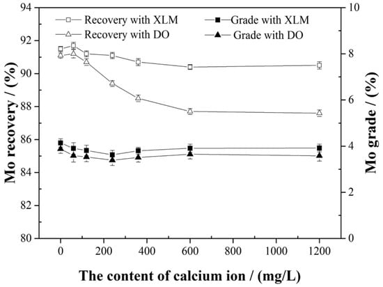 Figure 5 shows the adaptability of XLM in flotation water with different calcium ion concentrations at pH = 8. The data shows that firstly, two molybdenum recovery curves become flat before the concentration of calcium ion in flotation water is under 60 mg/L. Then, the molybdenum recovery decreases with increasing the concentration of calcium ion in flotation water. Finally, the recovery curve becomes flat again after the concentration of calcium ion is greater than 600 mg/L. Obviously, XLM as the collector has higher Mo flotation recovery than that of that of DO after Ca2+ concentration is over 100 mg/L. This further indicates that XLM has better adaptability than DO in the different Ca2+ concentration of flotation water.