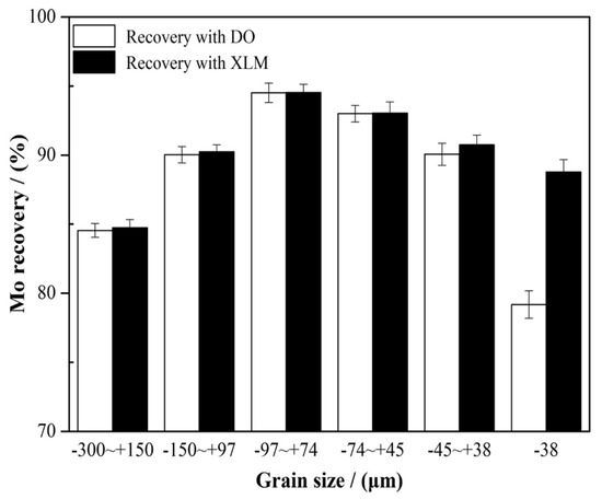 Figure 6 shows the flotation recovery of different size molybdenite particle in high-calcium water (pH = 8–9, Ca2+ = 800 mg/L) from screening product of flotation test. The data shows that the molybdenum recovery of −97~+74 micrometer fraction is better than another size of molybdenite particle in XLM and DO as collectors. Then, the molybdenum recovery decreases with declining/rising molybdenite particle sizes when molybdenite particle sizes are under/over −97~+74 micrometer fraction. Obviously, XLM had a greater improvement effect on the molybdenite flotation from a fine size fraction than from intermediate, medium and coarse-size fraction. For example, from −38-micrometer size fraction, molybdenite recovery increased from about 79.2% in DO as the collector to about 88.8% in XLM as the collector when flotation water is a high-calcium flotation wastewater (pH = 8–9, Ca2+ = 800 mg/L). However, that recovery is similar, within experimental errors, with DO or with XLM to the medium and large size fractions when flotation water is a high calcium flotation wastewater (pH= 8–9, Ca2+ = 800 mg/L). It is clear that the improvement effect of XLM on the flotation of molybdenite shown in Figure 5 is mainly attributed to the improvement of fine-size fractions. Wan et al. (2017) reported that the PAHs in XLM may absorb on the edges of molybdenite in the presence of Ca2+, hence reducing the deleterious effect of Ca2+ on the flotation of fine molybdenite. This indicates PAHs played a significant role to improve fine molybdenite particle recovery in HCFW.