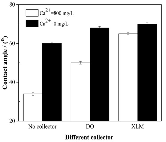 The contact angle of molybdenite in the absence and presence of XLM and DO as a function of Ca2+ concentration at pH 8 was studied. The result is shown in Figure 7. As can be seen, the contact angle of molybdenite in the presence 800 mg/L Ca2+ at pH 8 is lower than that of the absence Ca2+ at pH 8. Obviously, Ca2+ could decrease the hydrophobicity of molybdenite. This is in agreement with Zanin et al. (2009) who has also reported that Ca2+ did not affect the contact angle on the faces of molybdenite but reduced the contact angle on the edges of molybdenite at pH 8 [17]. Wan et al. (2017) also reported that the deleterious effect of Ca2+ on the flotation of molybdenite resulted from the interaction between Ca2+ and molybdenite edges [15]. The preferential oxidation of molybdenite edges produced MoO42− which made molybdenite edges negatively charged and attractive to Ca2+, leading to the formation of CaMoO4 precipitates responsible for depressing molybdenite flotation. The reaction equation governing the process is given by: