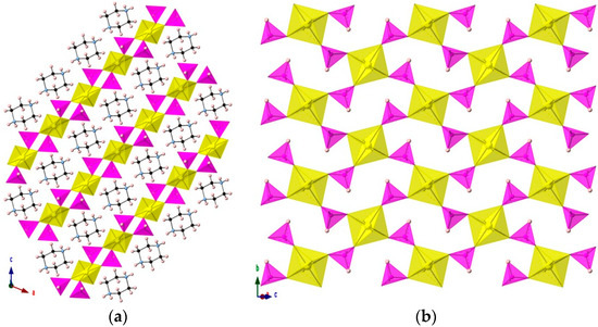 The structures presented here were synthesized at low pH conditions with phosphorous acid, piperazine, cesium carbonate, and uranyl nitrate. The first structure is that of [H2PZ][UO2(HPO3)2] (1), as shown in Figure 1. Similar to previous studies, by keeping the reaction time short (2 h) the redox reaction between phosphorous acid and UO22+ can be prevented and a uranyl phosphite compound can be isolated. Here the uranyl phosphite sheets of (1) have a rather unique topology amongst uranyl phosphite compounds. Each square bipyramid of U(VI) has four corner-sharing phosphite units in an interrupted autunite-type sheet. Unlike other members of the autunite family, where the tetrahedral anion shares each of its oxygen with square bipyramidal U(VI) polyhedra [32,34], here the proton on the phosphite ligand still points into the sheet but prevents any further bonding. This sheet topology had some similarities to another relative of the autunite family—K4UO2(PO4)2 [43]. Compound (1) appeared as a lower symmetry version of K4UO2(PO4)2 with the hydrogen atoms on the phosphite allowing for the uranyl square bipyramids to be slightly askew instead of aligned in the sheet causing symmetry disruption. Like K4UO2(PO4)2, (1) is anhydrous, but here the sheets were held together by hydrogen bonding from the piperazinium dication. The non-bridging oxygen atoms on the phosphites worked in conjunction with the “yl” oxygen of the uranyl unit to terminate the sheet and provide the source of hydrogen bonding.