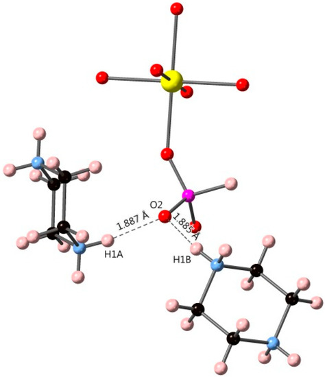 As stated previously, the one terminal oxygen on the phosphite unit participated in fairly strong hydrogen bonding to the charge balancing piperazinium dications found between the sheets of uranyl phosphite. In the reaction, the stronger phosphorous acid was able to transfer its acidic protons to piperazine to protonate both nitrogen atoms and create the piperazinium dication. This dication has been observed in different organic and inorganic structures [47,48,49,50,51,52] and has been previously used as an organic templating agent [53]. In the structure of (1), the nitrogen protons (H1A and H1B) on the piperazinium both showed strong hydrogen bonding to O(2) on the phosphite anion at ~1.89 Å each. Figure 2 depicts these hydrogen bonding interactions. The piperazinium cations hold the sheets together via hydrogen bonding, thereby eliminating the need for crystallographic waters of hydration to do the same. Crystals of (1) were quite large, as shown in Figure A1 (inset top) in the Appendix. When performing BVS calculations on the oxygen atoms, this terminal oxygen does not appear complete unless one considers this strong hydrogen bonding interaction [54], which raises its sum from 1.406 to a more reasonable 1.957. Comparing the piperazinium cation to a recent crystal structure of piperazine [55], showed similar C–C bond distances and some lengthening of the C–N bond by ~0.05 Å, commonly observed for other piperazinium cations.
