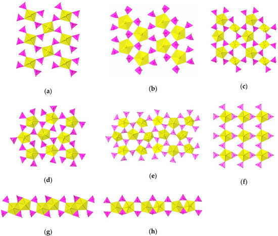 The eight different uranyl phosphite structure types are shown. The letter label corresponds with the “Structure Type” shown in Table 6. Labels (a)–(f) are all sheet topologies, whereas (g) and (h) are chains. (Please note images (c)–(h) are adapted from their original publication. (c) and (d) adapted with permission from Villa et al. [16]. (e) adapted with permission from Villa et al. [18]. (f)–(h) adapted from Villa et al. [56].
