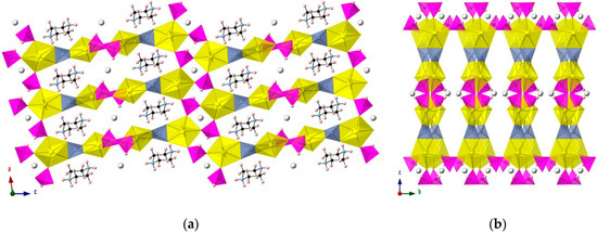 The coordination chemistry of U(IV) and U(VI) differ greatly and are described in detail in several excellent reviews [29,30,31,32,33,34,35]; a brief description is given in this study. Uranium(IV) is commonly an eight or nine-coordinate, although its coordination numbers can vary from six to twelve, and the distribution of ligands in its coordination sphere is largely isotropic. On the other hand, uranium(VI) in the presence of oxygen typically has two strongly bonded oxygen atoms, which gives rise to the linear uranyl cation, UO22+. Here the coordination environment is generally limited to tetragonal, pentagonal, or hexagonal bipyramids, and its geometries are highly anisotropic because of the short, terminal oxo atoms. These fundamental differences lead to divergent extended structures, with U(IV) usually yielding 3D networks, whilst U(VI) is most often found in 2D sheets or 1D chains.