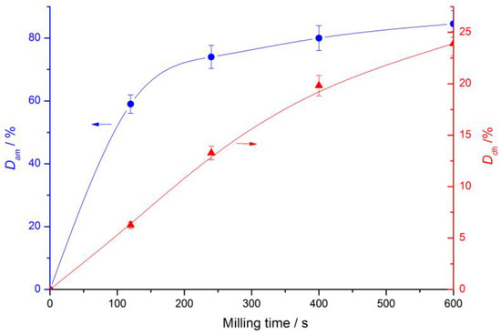 From Figure 3, it can be seen that Dam increased rapidly to ~70% during the first 200 s of MA. The Dam continued to increase smoothly, reaching ~85% by 600 s.