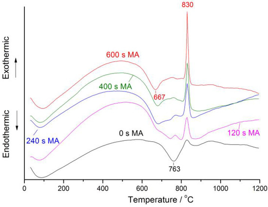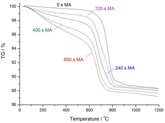 where W0 and WMA are the weight losses relative to the temperature range from the onset of the dehydroxylation endotherm (Figure 4) to 1200 °C for initial and MA antigorite, respectively. From Figure 3, it can be seen that Ddh increased almost linearly with increased milling time, reaching ~24% after 600 s of milling.