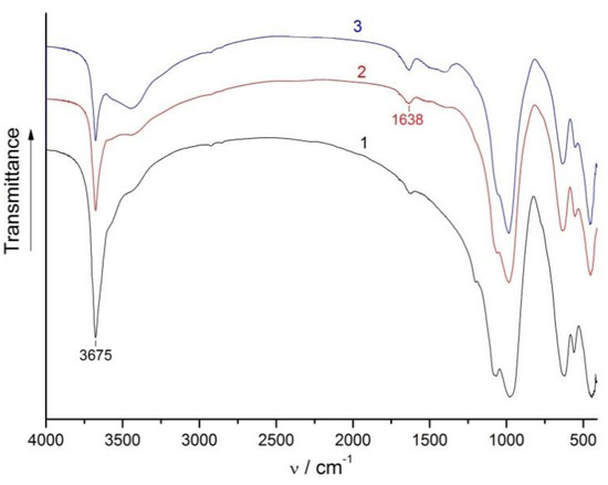 Fourier transform infrared spectra of 1: initial antigorite, 2: antigorite milled in moderate conditions for 600 s in air, 3: alkali-activated binder prepared using antigorite milled for 600 s in moderate conditions in air and liquid glass with a modulus of 2.25 (the amount of liquid glass added corresponded to 3% Na2O, curing time in dry conditions was 28 days).