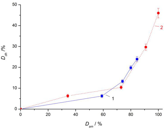 The Ddh values as functions of Dam were derived from the data shown in Figure 3, and are illustrated in Figure 7. It should be noted that, for vibratory milled antigorite, the peak area of (001) reflection and loss of structural water have been determined as functions of milling time in previous publications [10]. We used these data to evaluate Dam and Ddh values as described above; the corresponding curve is also shown in Figure 7. Although the MA conditions (type of mill, milling bodies to sample ratio, milling time and so on) are quite different for the two data sets, the resulting curves are very similar. This confirms the close relationship between the disordering of the crystal structure of antigorite and dehydroxylation, regardless of the type of mill used for MA.