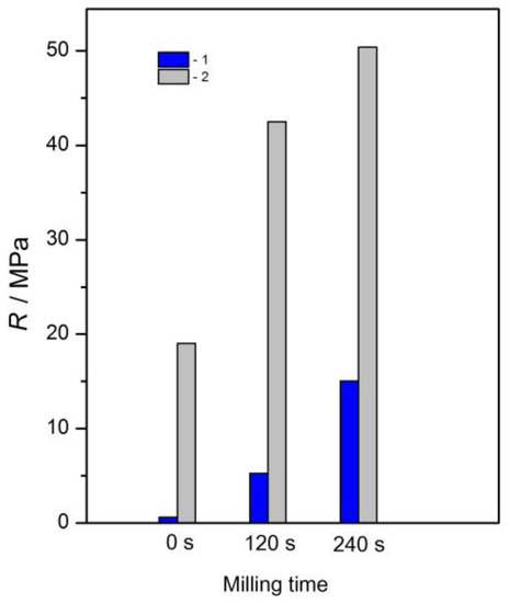 It is well established that the particle size decrease that occurs during intensive MA results in the following effects: (i) irreversible plastic deformations of the particles’ surface layers leading to the formation of structural defects; (ii) strengthening of the particles due to unfavourable conditions for crack formation; (iii) reduction of the energy of milling bodies due to increased inter-particle contacts and initiation of viscous behaviour of a fine powder; and (iv) aggregation of particles. As a result, with increased milling time, the rate of aggregation becomes equal to the rate of disintegration, at which point Ssp reaches the highest value obtainable in experimental conditions [25,26,42]. It can be seen from Figure 1 that, during moderate conditions of MA (curves 1, 2 and 3), the Ssp values approached their maximum values within 8–10 min of milling. However, when hard MA of antigorite was carried out in air, the Ssp increased sharply to reach ~25 m2/g in the first 2 min, then decreased gradually to reach ~8 m2/g by 10 min (Figure 1, curve 4). This can be explained by acceleration of the above-mentioned processes leading to particle aggregation outweighing disintegration after 2 min of MA. A similar dependence of the Ssp has been reported for serpentine milled in air for 240 min in a Fritsch Pulverissette-7 planetary mill (3 g of the sample were milled with 7 agate balls of 15 mm diameter; the rotational speed of the mill was 700 rpm) [12].