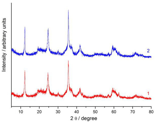 The X-ray diffraction patterns of 1: antigorite milled in moderate conditions for 600 s in air, 2: alkali-activated binder prepared using antigorite milled for 600 s in moderate conditions in air and liquid glass with a modulus of 2.25 (the amount of liquid glass added corresponded to 3% Na2O, curing time in dry conditions was 28 days).